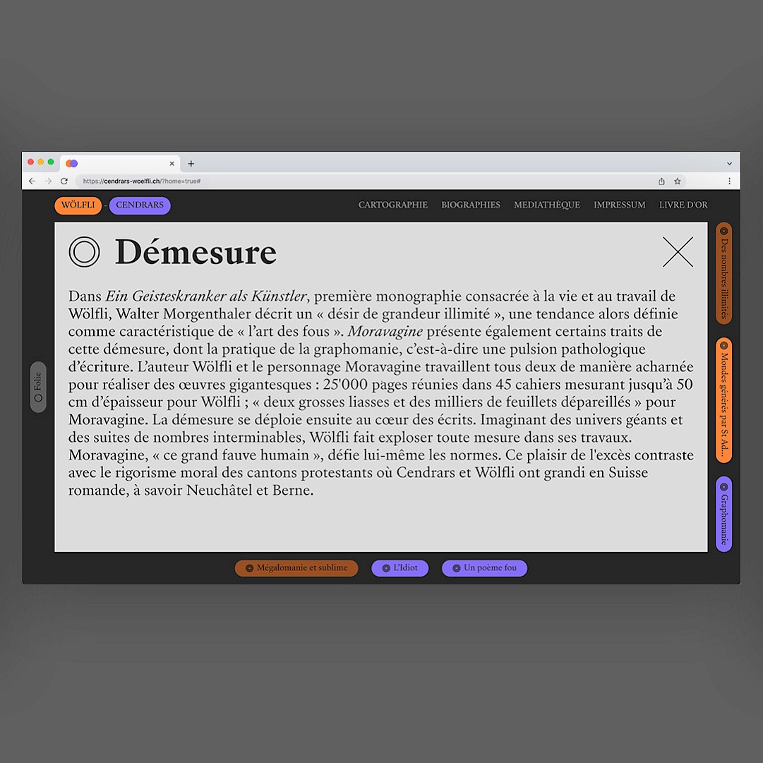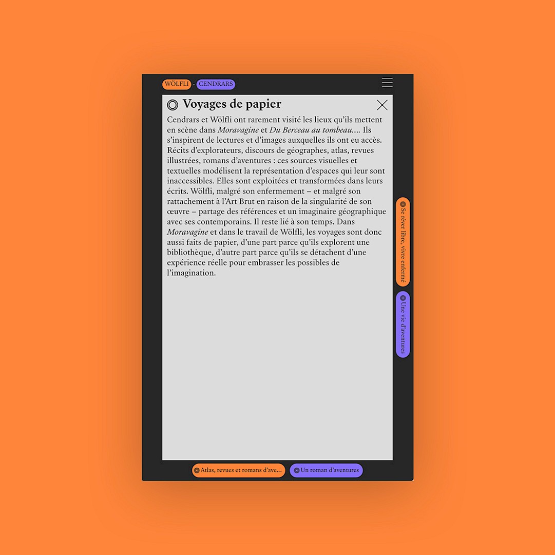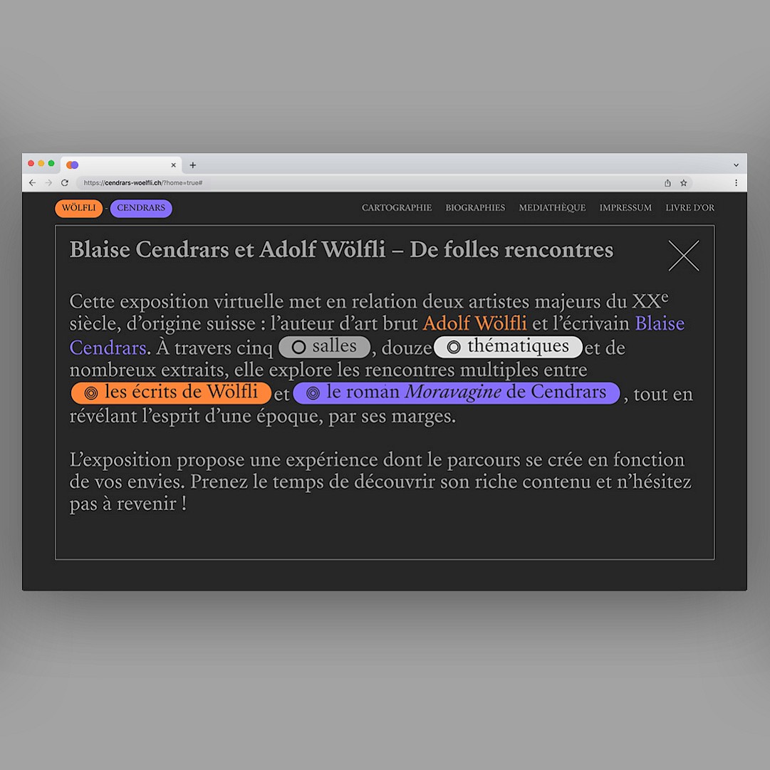 INT a été commissionné par la fondation Blaise Cendrars pour créer une exposition virtuelle mettant en relation deux artistes majeurs du XXe siècle: l’auteur d’art brut Adolf Wölfli et l’écrivain Blaise Cendrars.