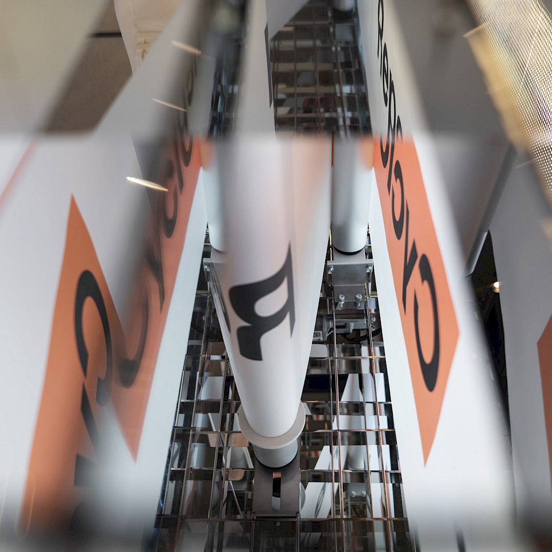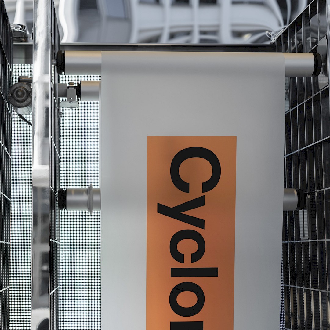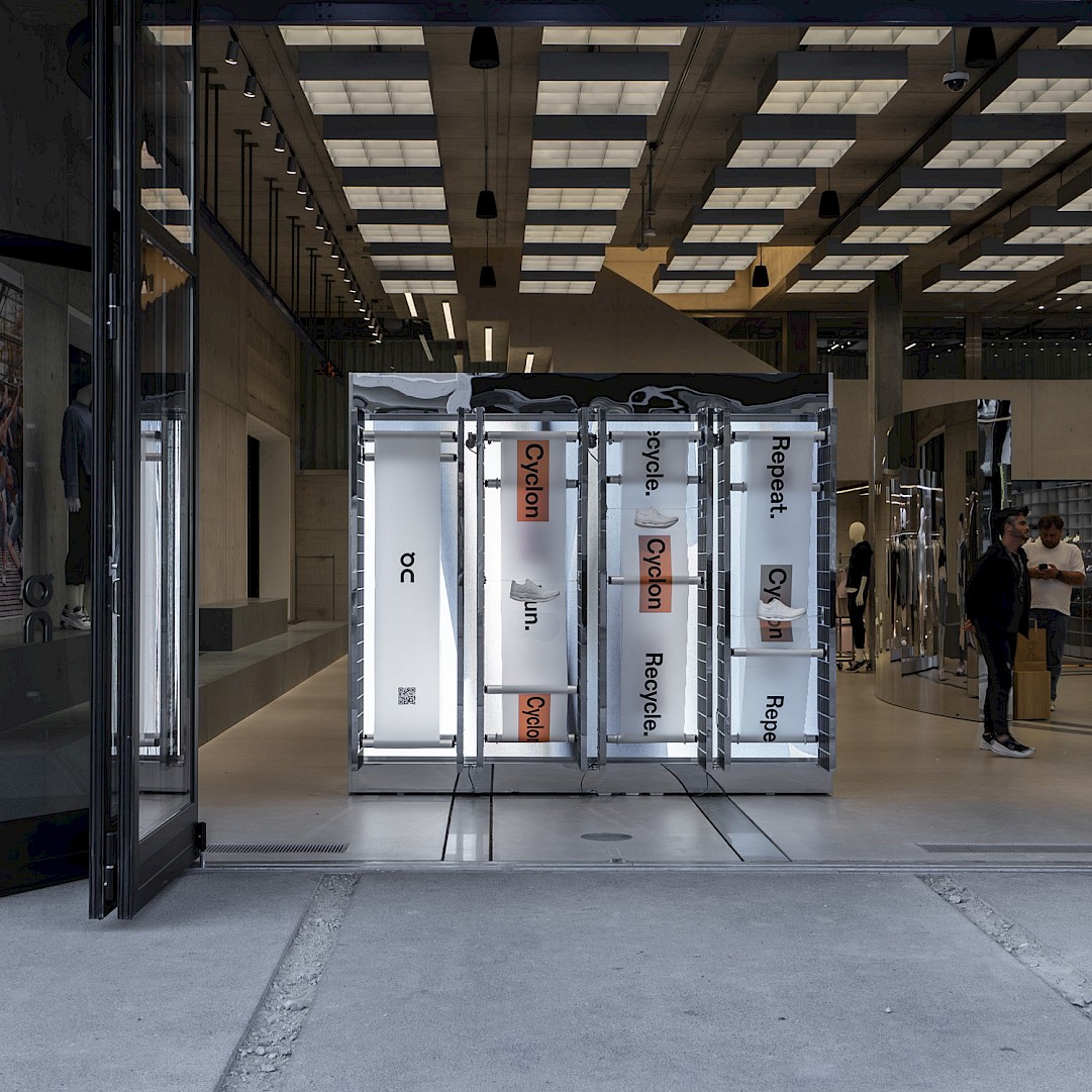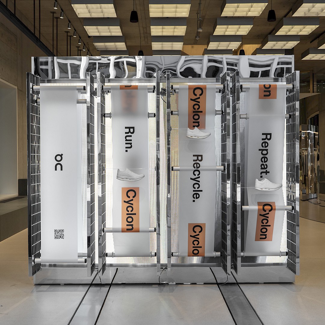 In this context, we collaborated with the ON design team to create and engineer an installation consisting of three ribbons slowly rotating in a loop. They are made of tracing paper with the words "run, recycle, repeat, cyclon" printed on it, metaphorising the concept of recycling.
