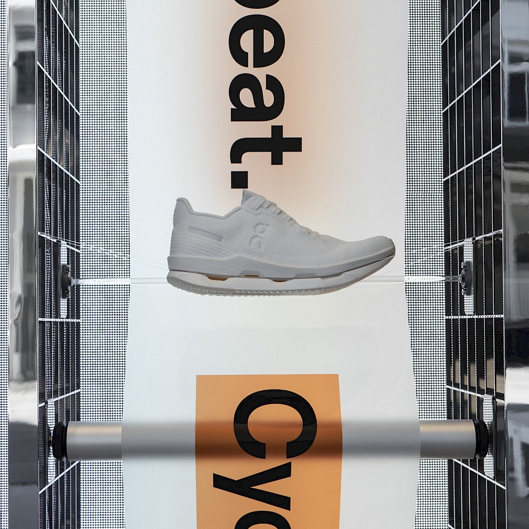 Continuing our partnership with the swiss brand: ON running, we realised a kinetic window display to highlight their new Cloudneo recycled shoes as part of the Cyclon campaign.