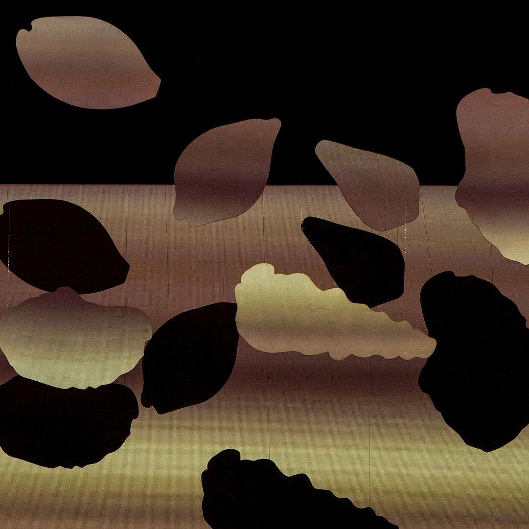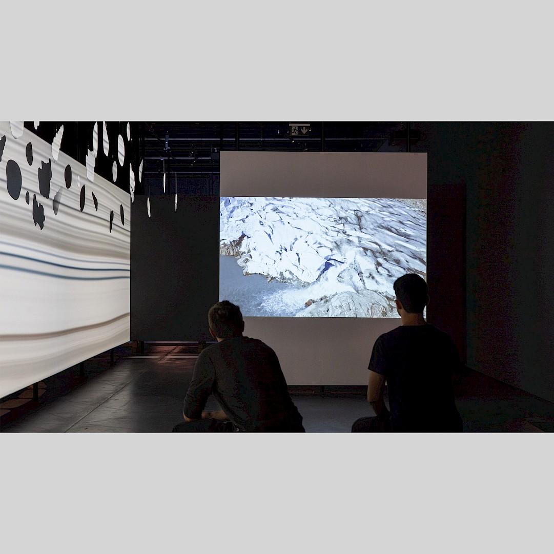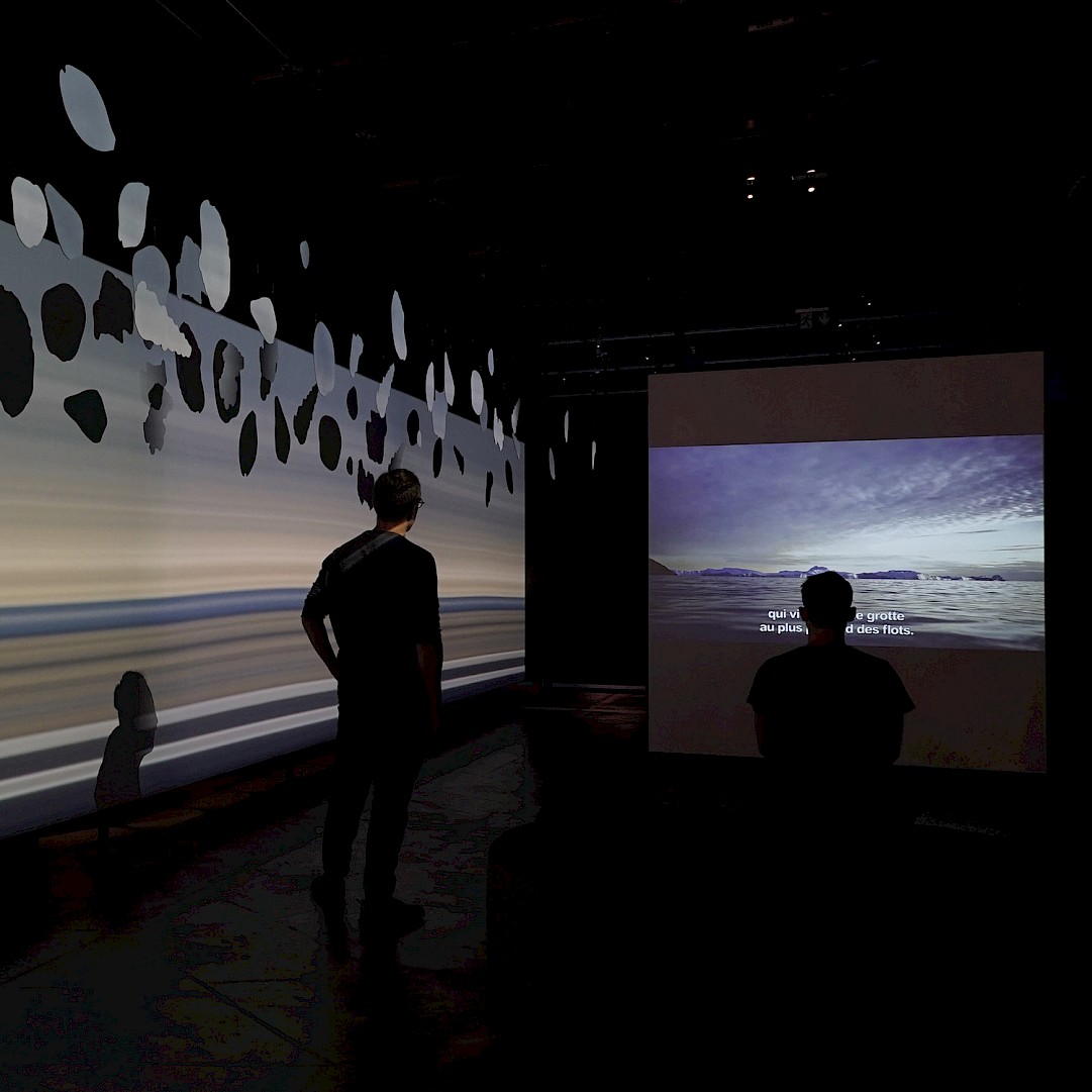 The first one is a 13m video projection which helps the visitors to be immersed into the poetic video installed nearby. The video by Daniel Lin depicts two indigenous women poets meeting at the source of our rising seas to share a moment of solidarity. We analysed the color of the video and have generated a new abstract animation composed of wavy color lines and synchronized with the original video. On the top of the projection, we have hung, in a minimal way, cuted shapes of stones and shells, two symbolic objects appearing in the video. The overall composition creates a poetic collage reminiscent of Matisse's cut-outs.