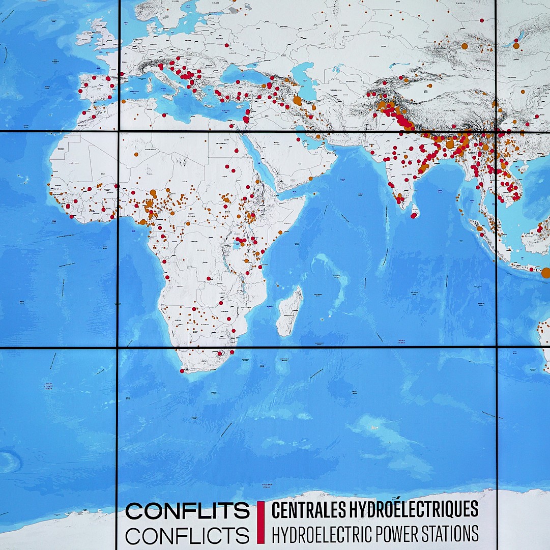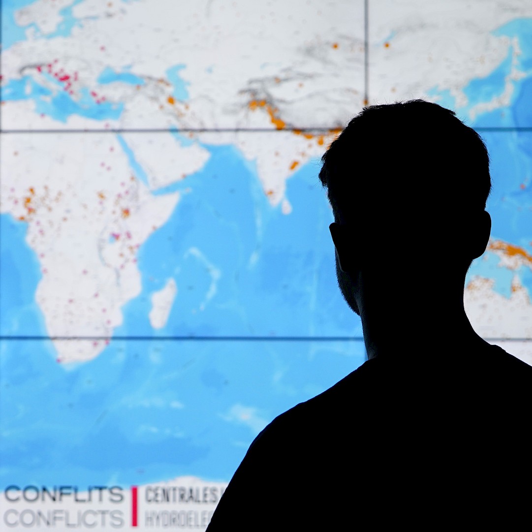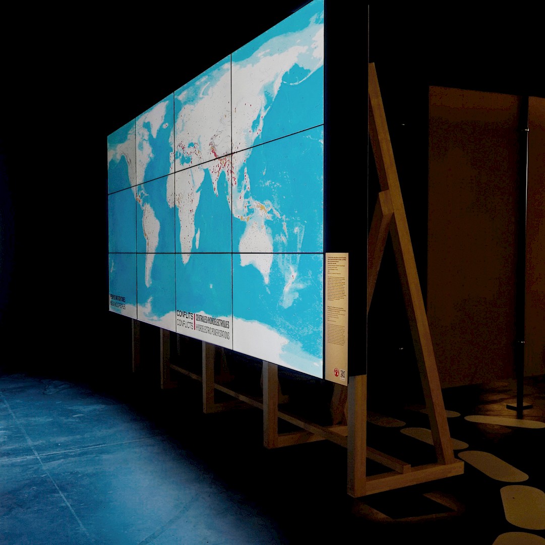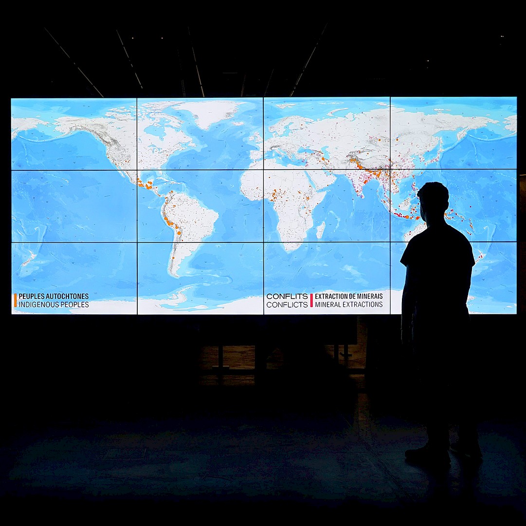 The last one is a twelve screens video installation which together create a large world map displaying different data visualization on the indigenous people (location, conflicts etc).