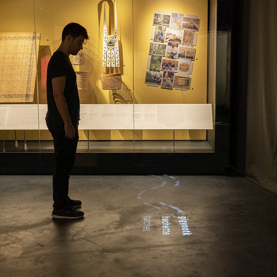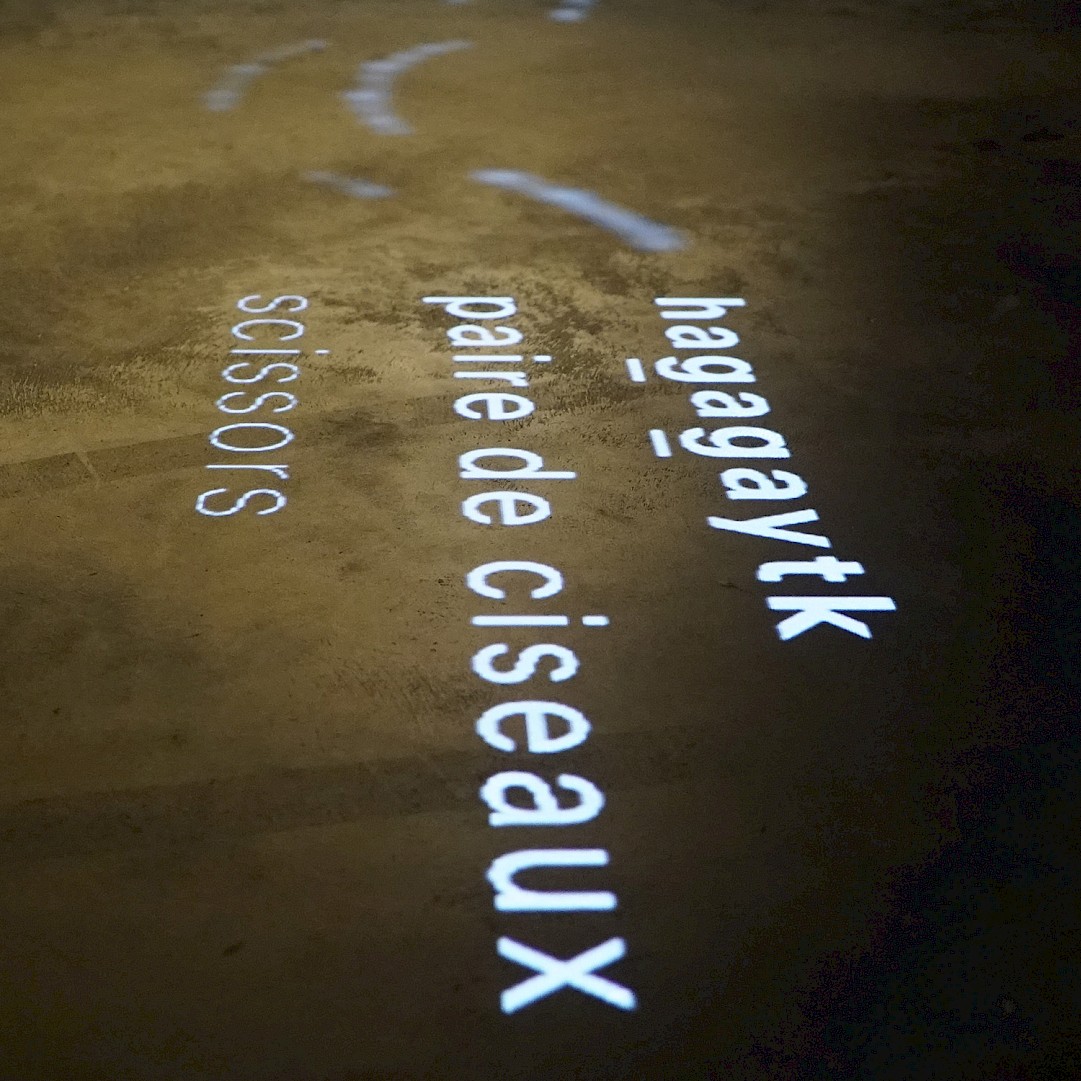 The second one is an audio-visual installation, where visitors can hear words in Sm'algyax (Dialect of the Tsimshian language spoken in northwestern British Columbia and southeastern Alaska) on the topics of the craft trades in indigenous areas. The sound is accompanied by a video on the floor where words in Sm'algyax and its translation in french and english are projected. The wave-shaped typo animation echoes other curves appearing elsewhere in the exhibition.