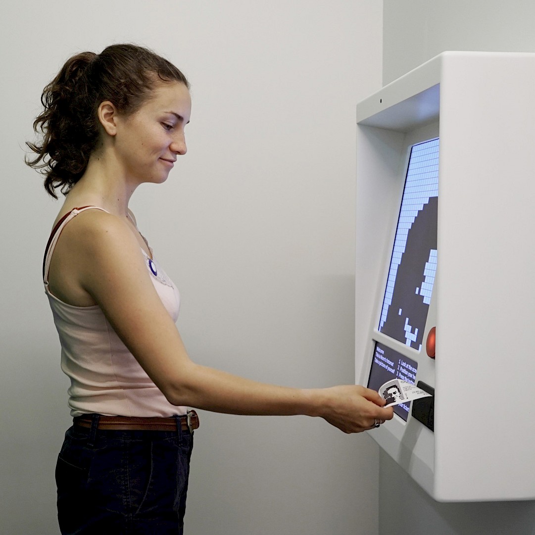 Cet objet fonctionne comme un photomaton selon les règles de l'Archive U.768: il produit des images de 24 x 32 pixels en noir et blanc qui sont imprimées par une imprimante thermique. Les visiteurs peuvent ainsi rapporter chez eux leur portrait imprimé en souvenir de leur visite de l'exposition.