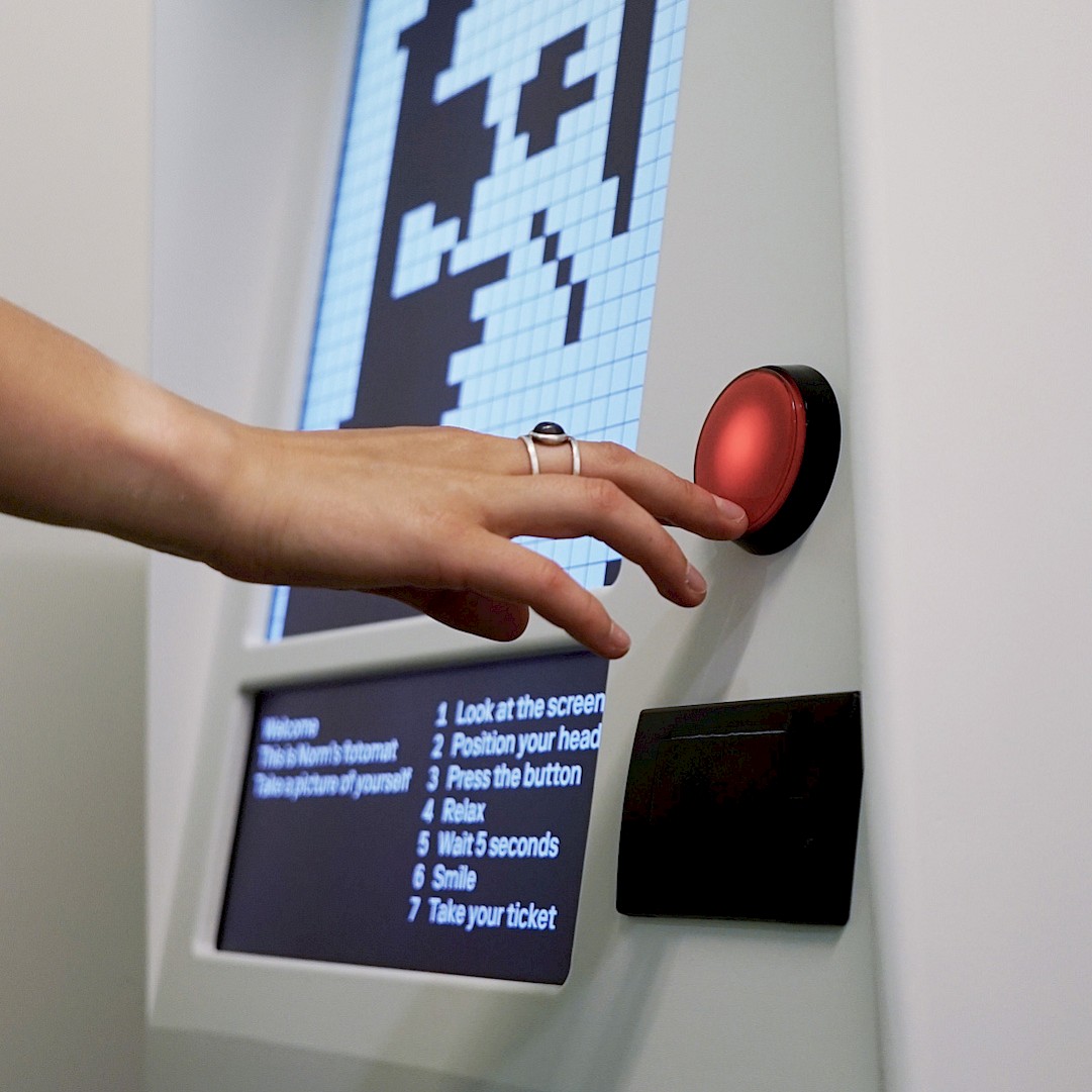 «Fotomat» est une installation interactive réalisée pour le studio de graphisme NORM. Elle imprime un portrait pixelisé de vous en souvenir de votre visite.