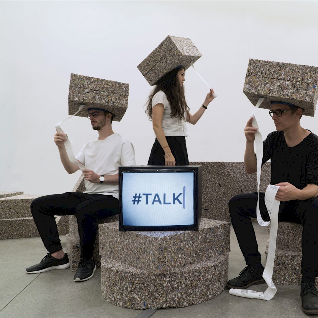 #eat, #live, #work, #travel, #sleep, #talk. Each hashtag can activate one hat containing a thermal printer which prints the live Twitter discussions taking place during the event. Additionally, when someone wears the hat, it generates and prints questions related to the topic.