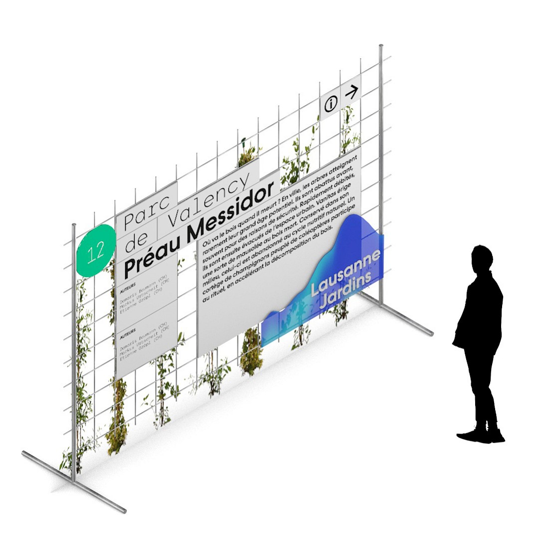 We generated the poster using code and created a scenography made of construction site barriers echoing the grid of the visual identity. Plants and other signage elements could then be added in a modular way to the metal structure. For the website we had the idea of being able to display a map of Lausanne with several layers of information: planting, water networks, location of the festival's artworks.