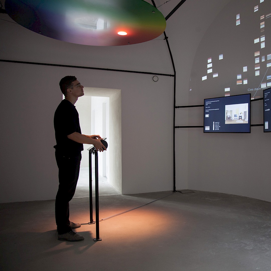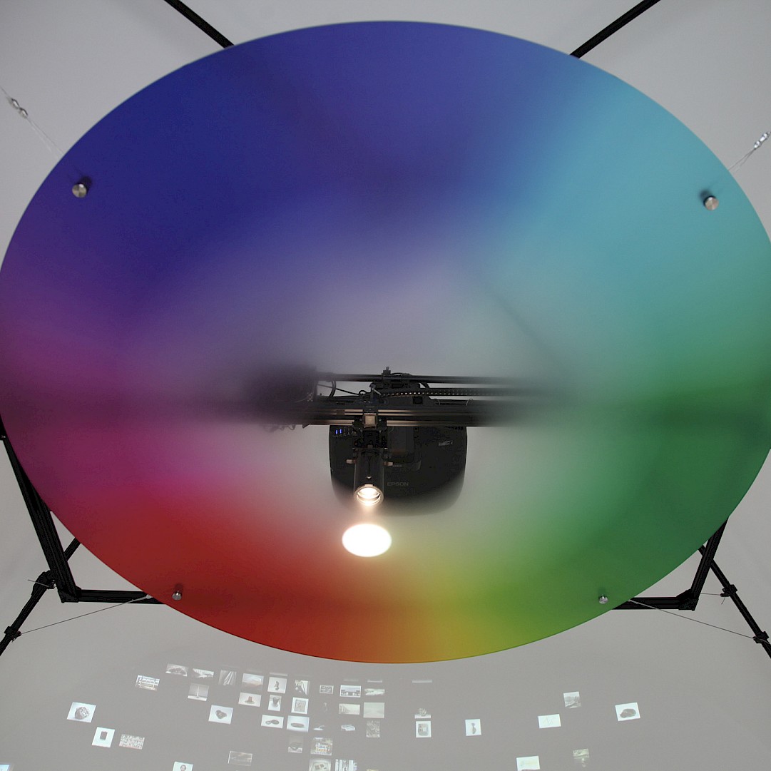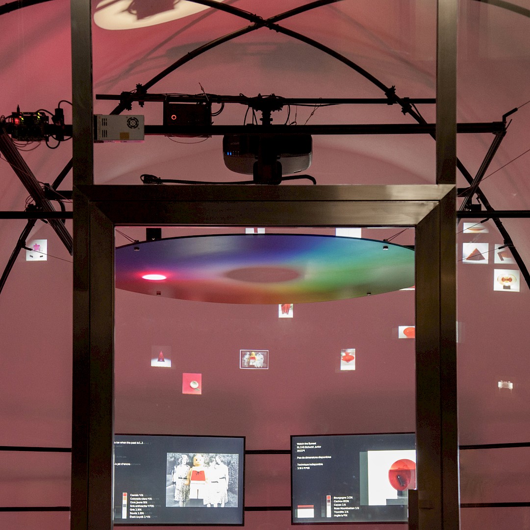 La sculpture met en lumière l’interrogation de la base de données. Le cercle chromatique suspendu au centre et la mécanique s’animent pour illustrer le chemin emprunté pour accéder à la couleur choisie. Par immersion, le visiteur se retrouve plongé dans les collections du mudac et du Musée de l’Elysée.