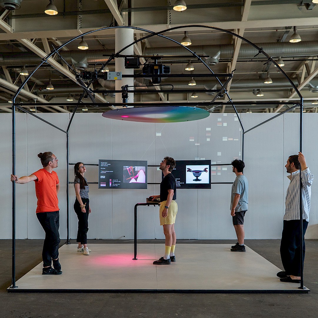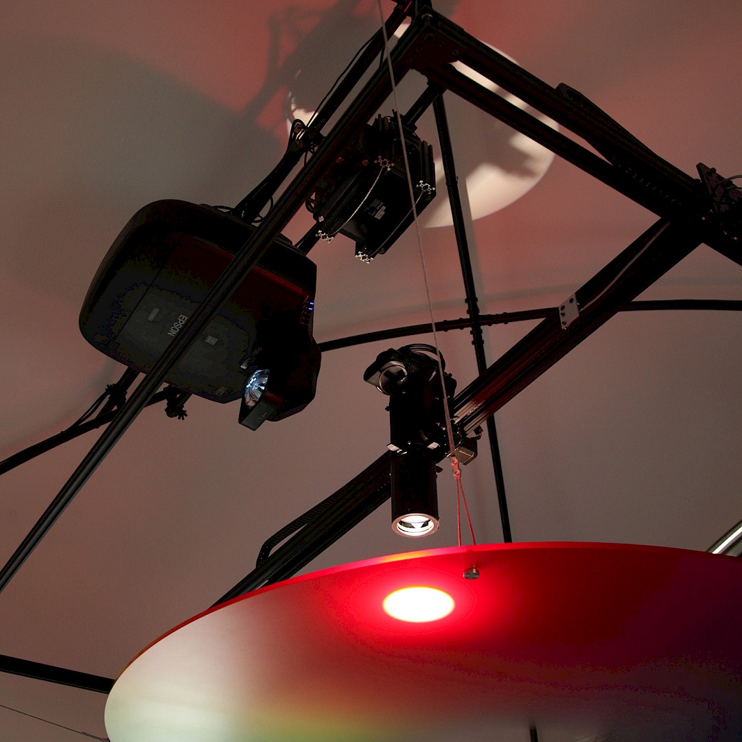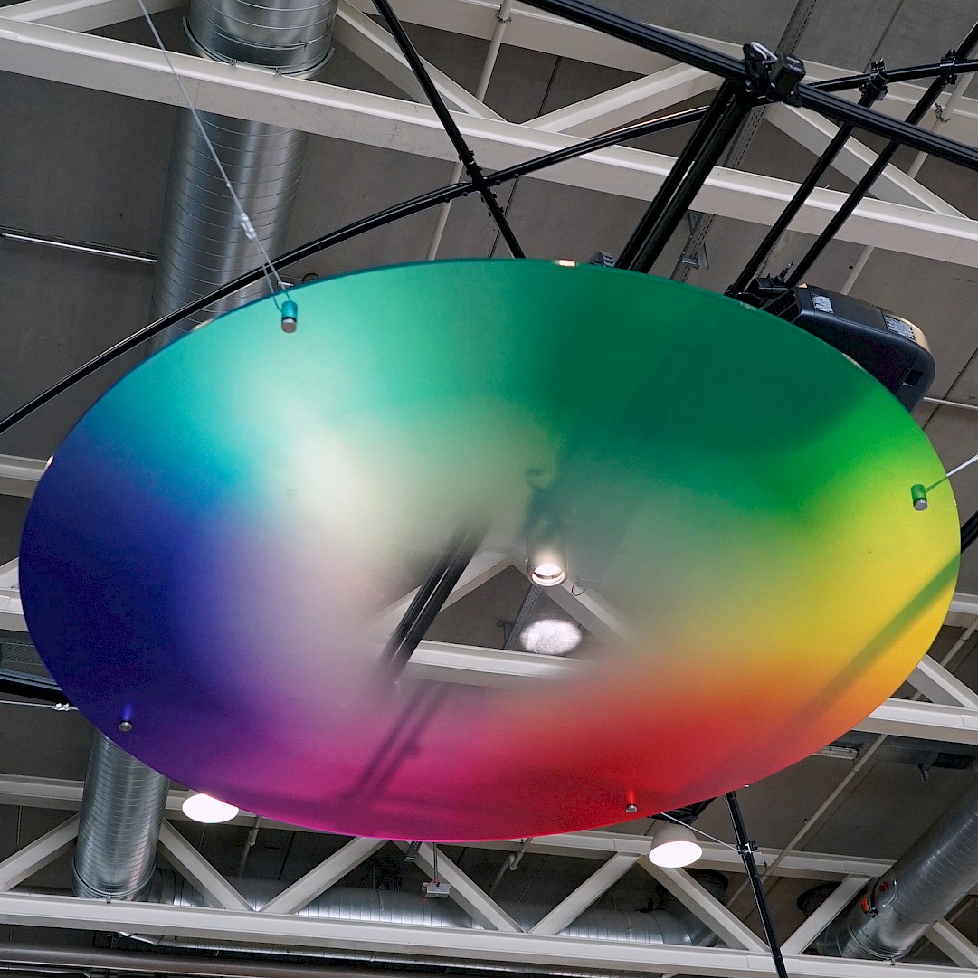 La sculpture met en lumière l’interrogation de la base de données. Le cercle chromatique suspendu au centre et la mécanique s’animent pour illustrer le chemin emprunté pour accéder à la couleur choisie. Par immersion, le visiteur se retrouve plongé dans les collections du mudac et du Musée de l’Elysée.