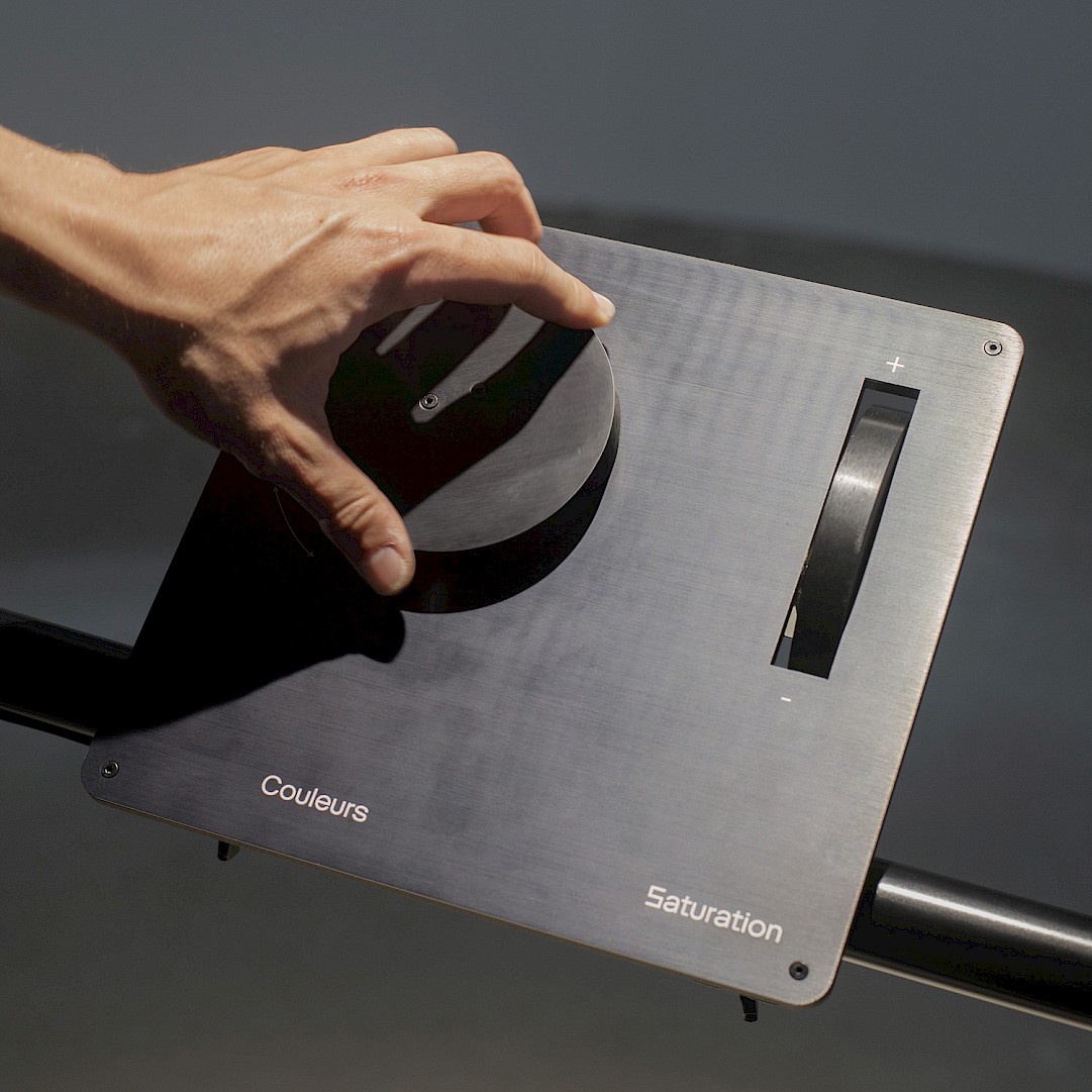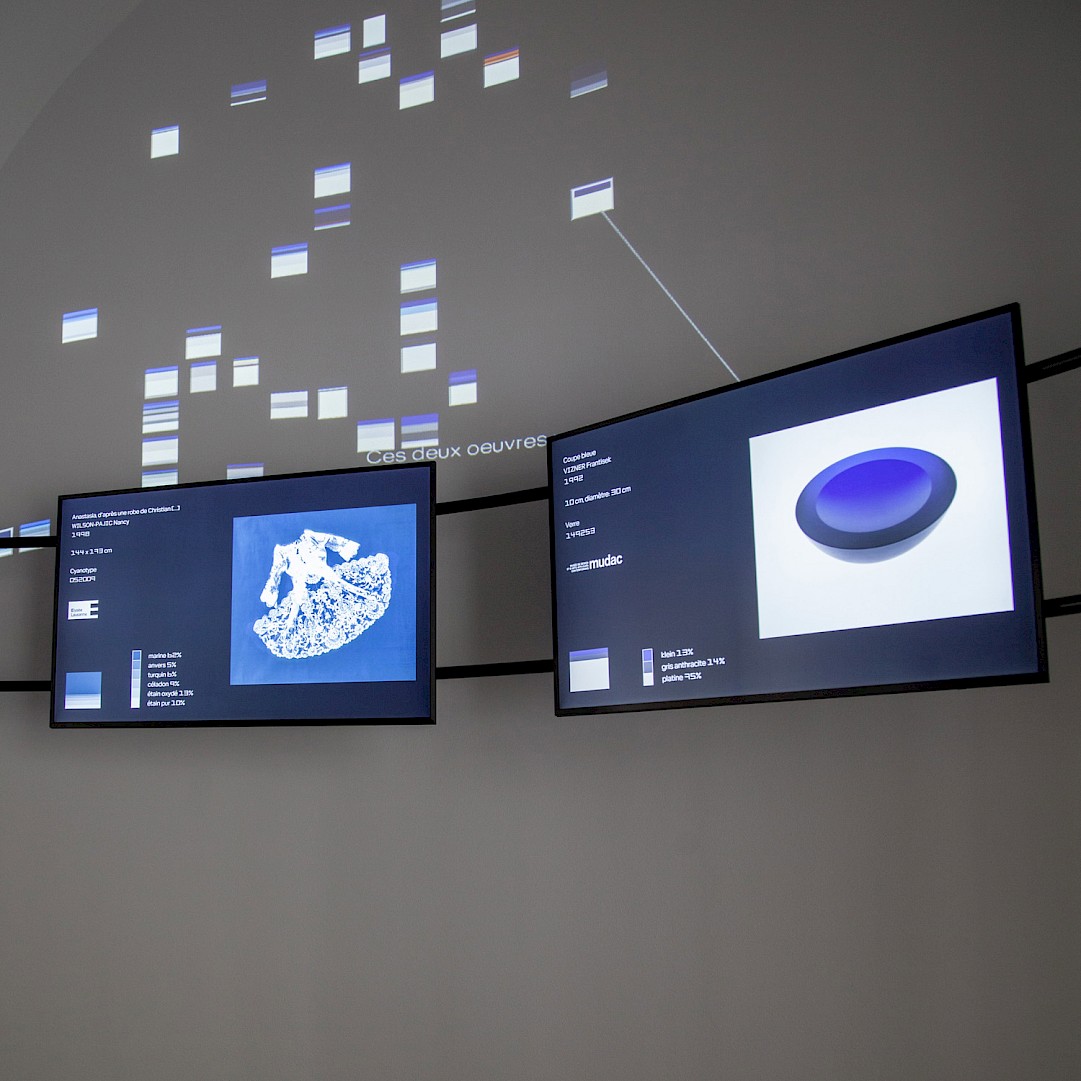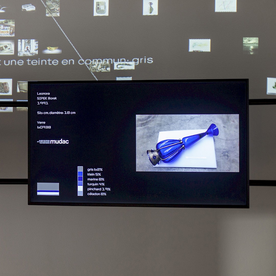 Pour cette première version, une sélection d’environ 1000 objets du mudac et du Musée de l’Elysée ont été analysées par un logiciel pour déterminer la valeur (RGB) de chaque pixel. L'algorithme crée un nuancier propre à chaque œuvre. Il les place ensuite sur une grille projetée au mur. A l’aide d’un contrôleur, le visiteur est invité à choisir une position dans le spectre de couleurs (axe X) et la saturation (axe Y). Les deux objets les plus proches de la couleur choisie s’affichent sur les écrans principaux.