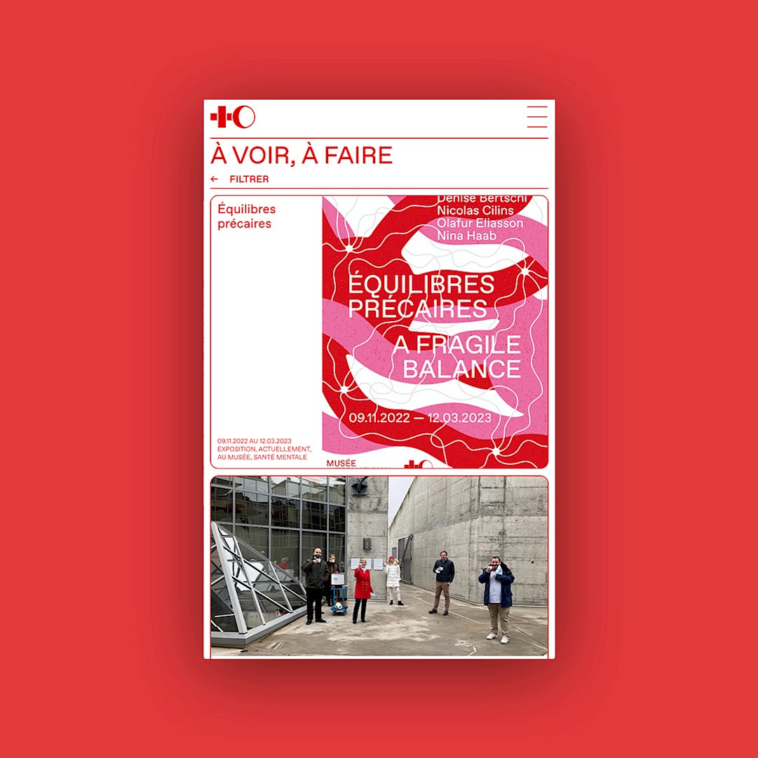 Le design graphique a été développé en collaboration avec le studio Enen, qui a réalisé la nouvelle identité visuelle du Musée de la Croix-Rouge.