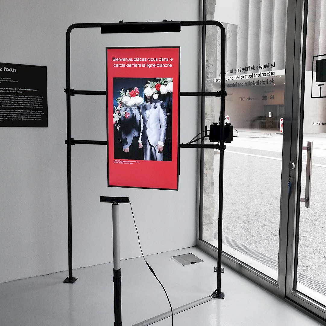 Narrative focus is an evolution of the Eye Tracking project developed at the Musée de l'Elysée on photographs by Matthias Bruggmann and Paolo Woods. This new version presents a sound journey around the works of Laurence Rasti (There are no homosexuals in Iran), Yann Gross and Léo Fabrizio (in alternation). The path travelled by the gaze is recorded anonymously in order to study how visitors observe the images.