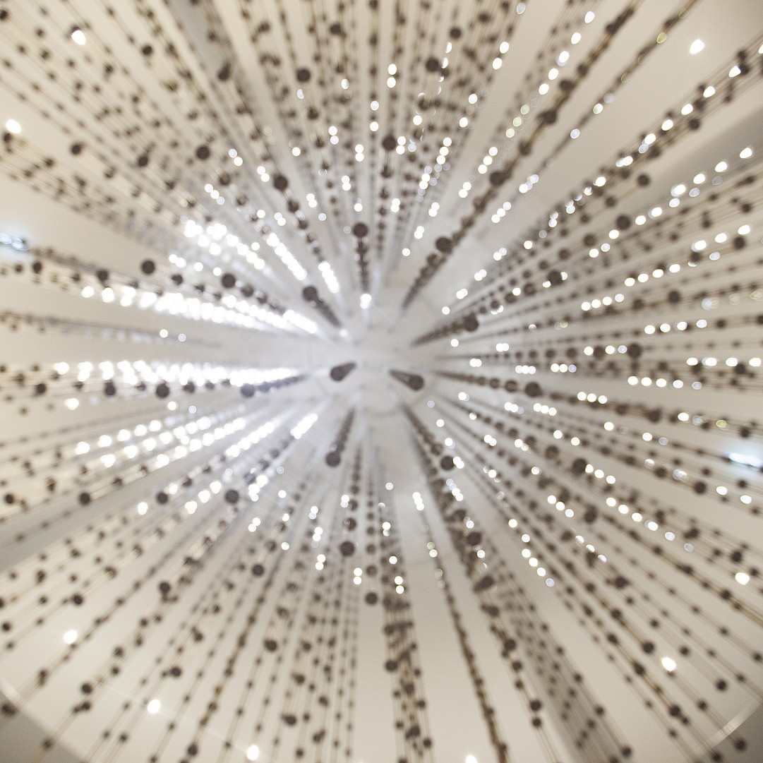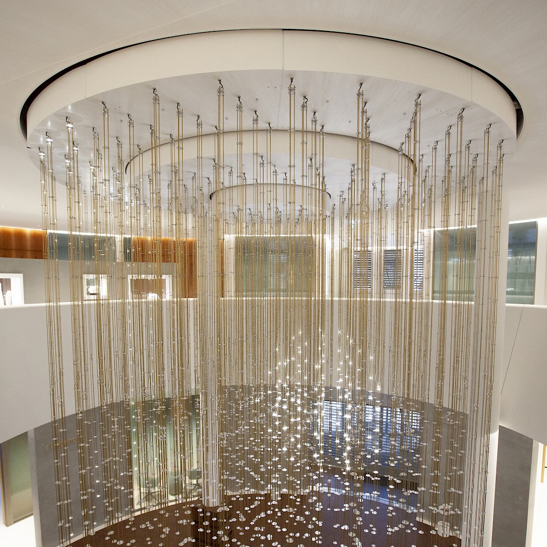 L’installation, suspendue dans l’entrée de la nouvelle BCGE à Genève, épouse parfaitement à l’architecture circulaire du bâtiment rénové. Produite sur mesure à notre atelier après une étape de prototypage, elle forme un cylindre de 4 x 4 m. Celui-ci est composé de fines barres de laitons qui accueillent une matrix de plus de 9000 leds permettant d’y diffuser une animation temps réel. Le tout est fixé sur trois plateaux de forme ronde disposés avec de légers écarts. Un logiciel permet d’alterner la fréquences de luminosité des leds de sorte à simuler l’effet de scintillement des rayons solaires sur la surface du lac, aussi appelé effet de parhélie.