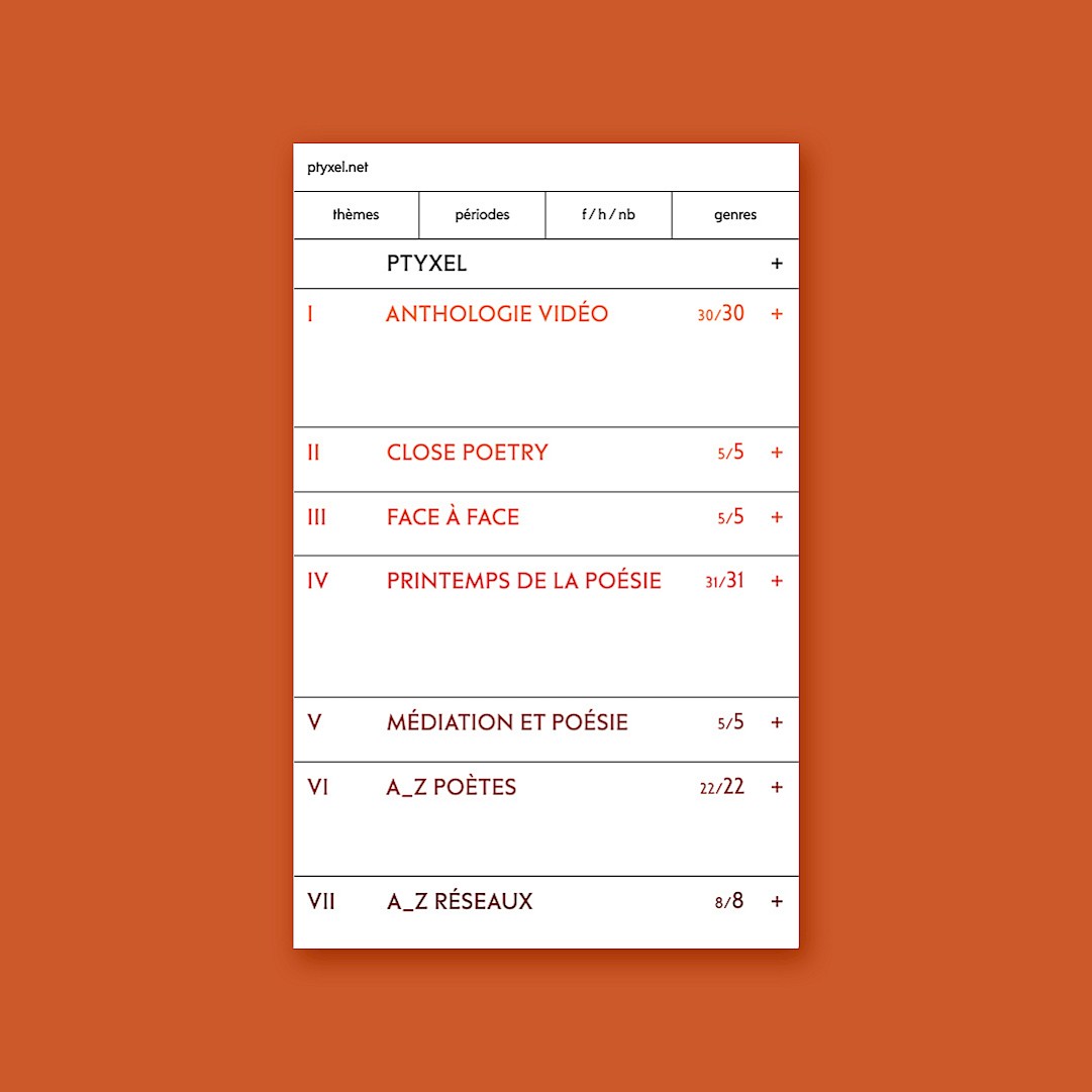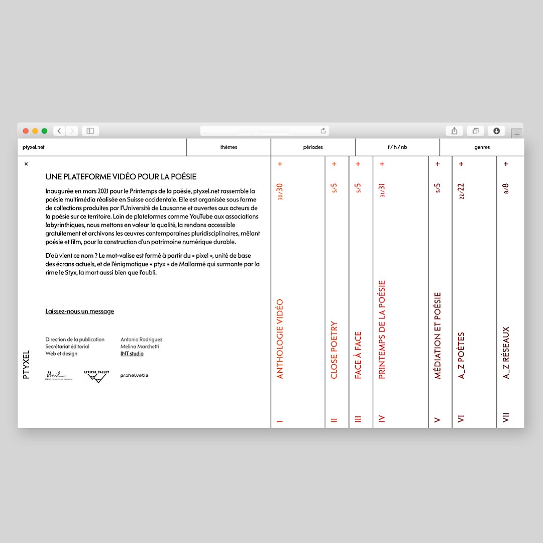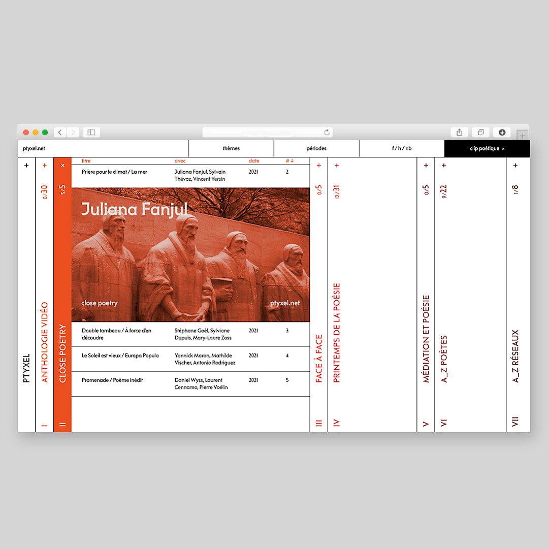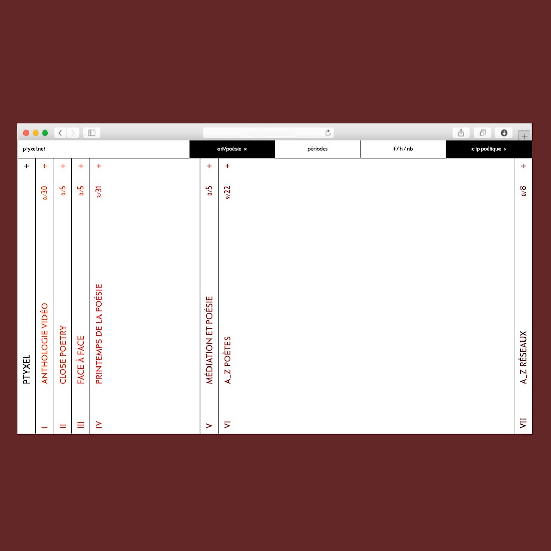 Comment revaloriser un patrimoine de poèmes grâce au numérique en créant une archive en ligne pertinente ? Développée à l'occasion du "Printemps de la Poésie 2021", Ptyxel est une plateforme web permettant aux visiteurs de naviguer parmi des vidéos poétiques par collection. Le site rassemble la poésie multimédia réalisée en Suisse occidentale.