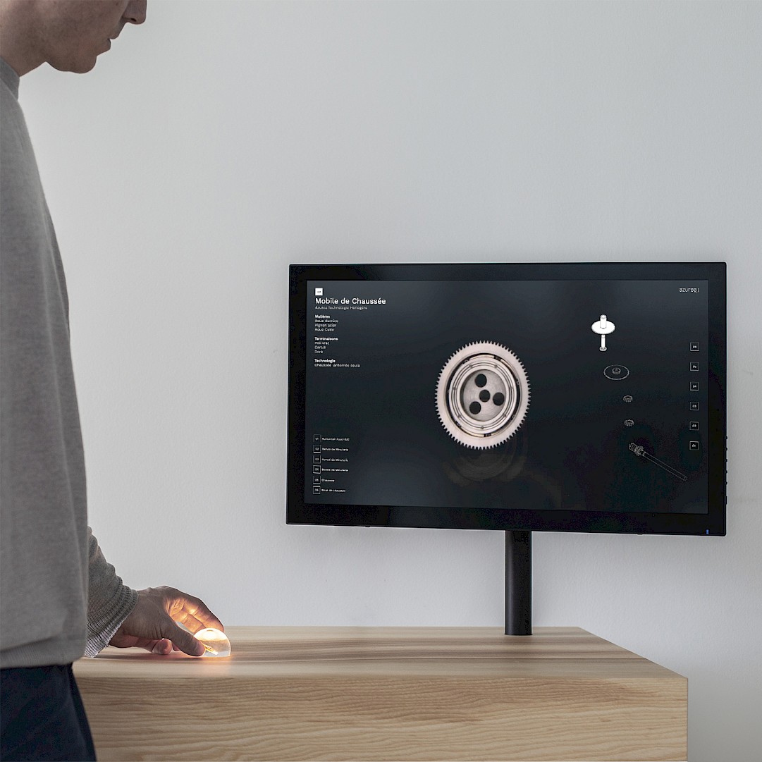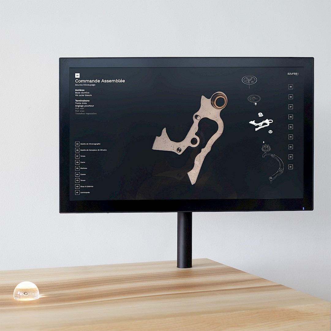 Augmented components is an interactive installation showcasing Azurea’s expertise in the manufacturing and assembly of micromechanical components. Through a macro camera and an advanced image recognition system, each movement, encapsulated in a transparent sphere, is magnified in real-time on a screen alongside detailed information, thus unveiling the full intricacy of Swiss watchmaking.