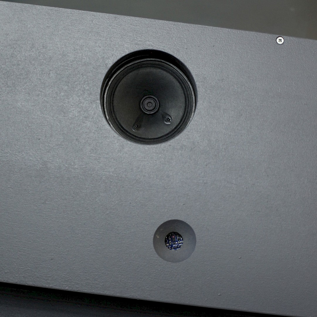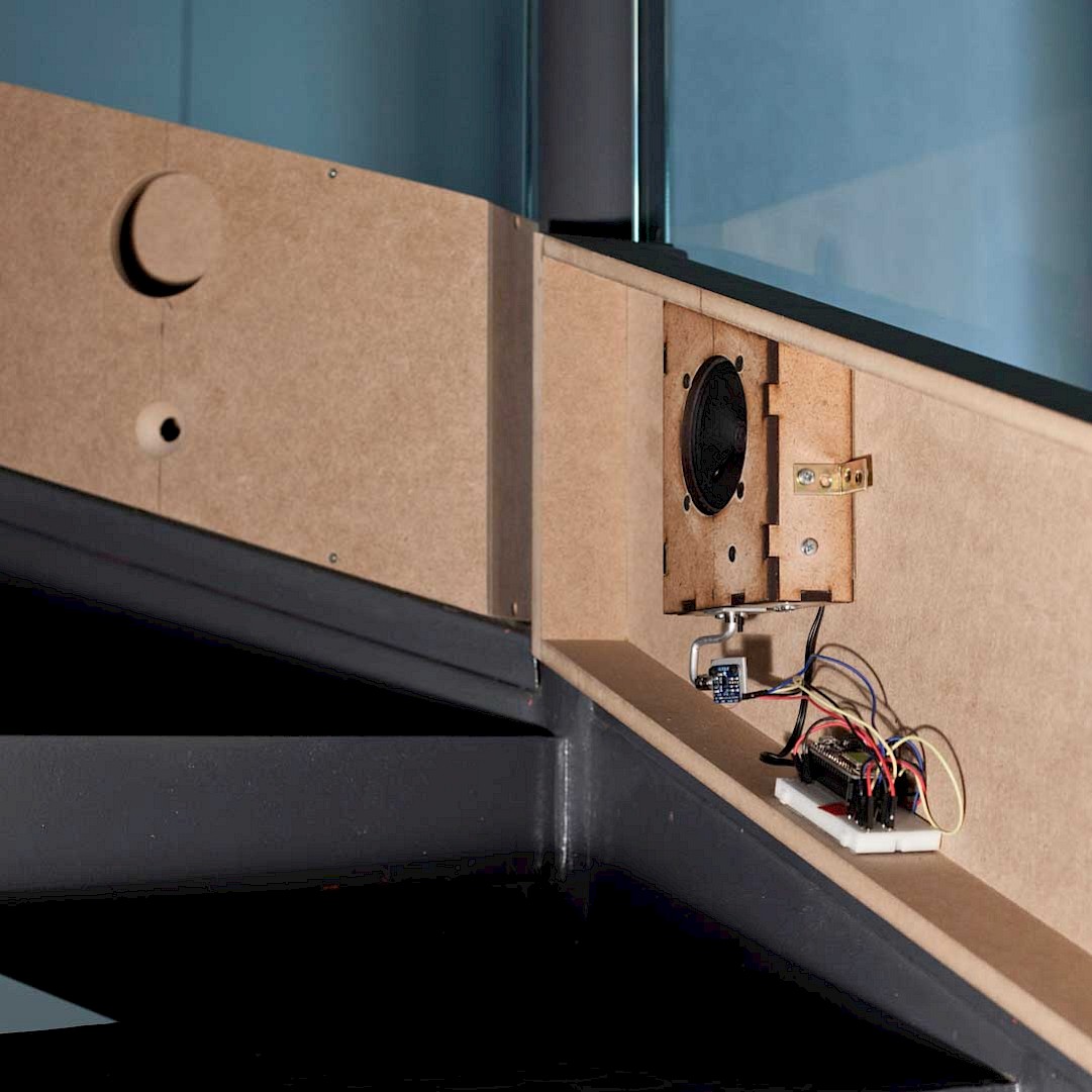 Nous avons été mandatés par le Musée d'Histoire Naturelle de Neuchâtel pour réaliser une installation sonore interactive dans le cadre de "Pôles, feu la glace", une exposition d'un an sur les pôles Nord et Sud. L'installation se déploie dans un escalier de quinze marches qui ouvre l'exposition. Une plinthe en bois contenant quinze capteurs de distance et haut-parleurs est fixée sur la partie inférieure de la rambarde.