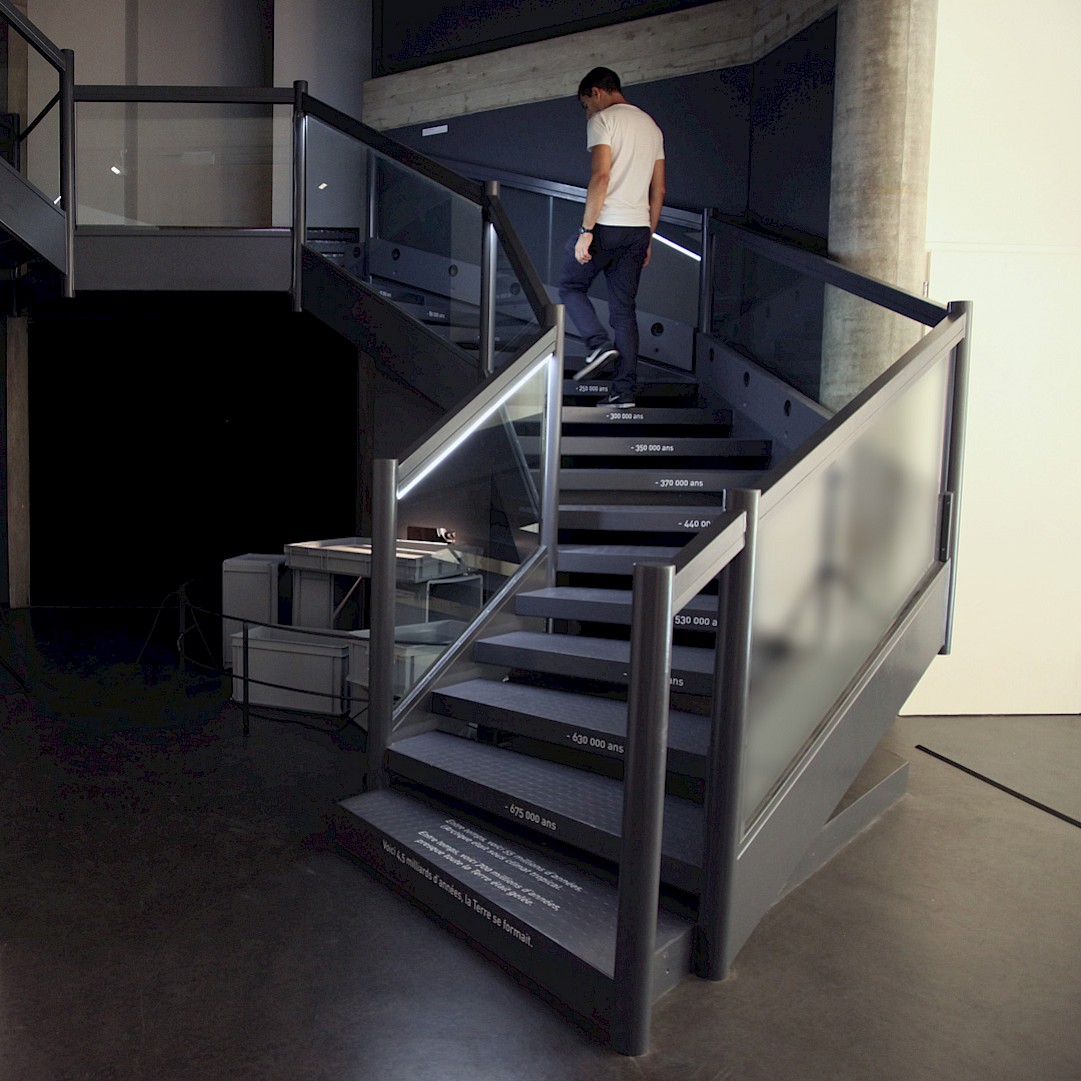 Chaque marche d'escalier correspond à une période de glaciation ou de réchauffement dans l’histoire, de 750'000 ans avant J.-C. (marche 1) à aujourd'hui (marche 15). Lorsque les visiteurs montent les escaliers, leurs pieds déclenchent un son différent sur chaque marche. Nous avons également inclus une notion d’aléatoire dans les sons pour offrir aux visiteurs une nouvelle expérience à chaque fois qu'ils traversent l'installation.