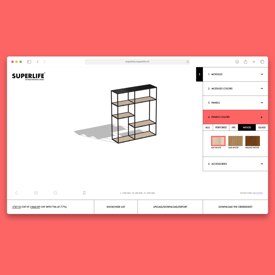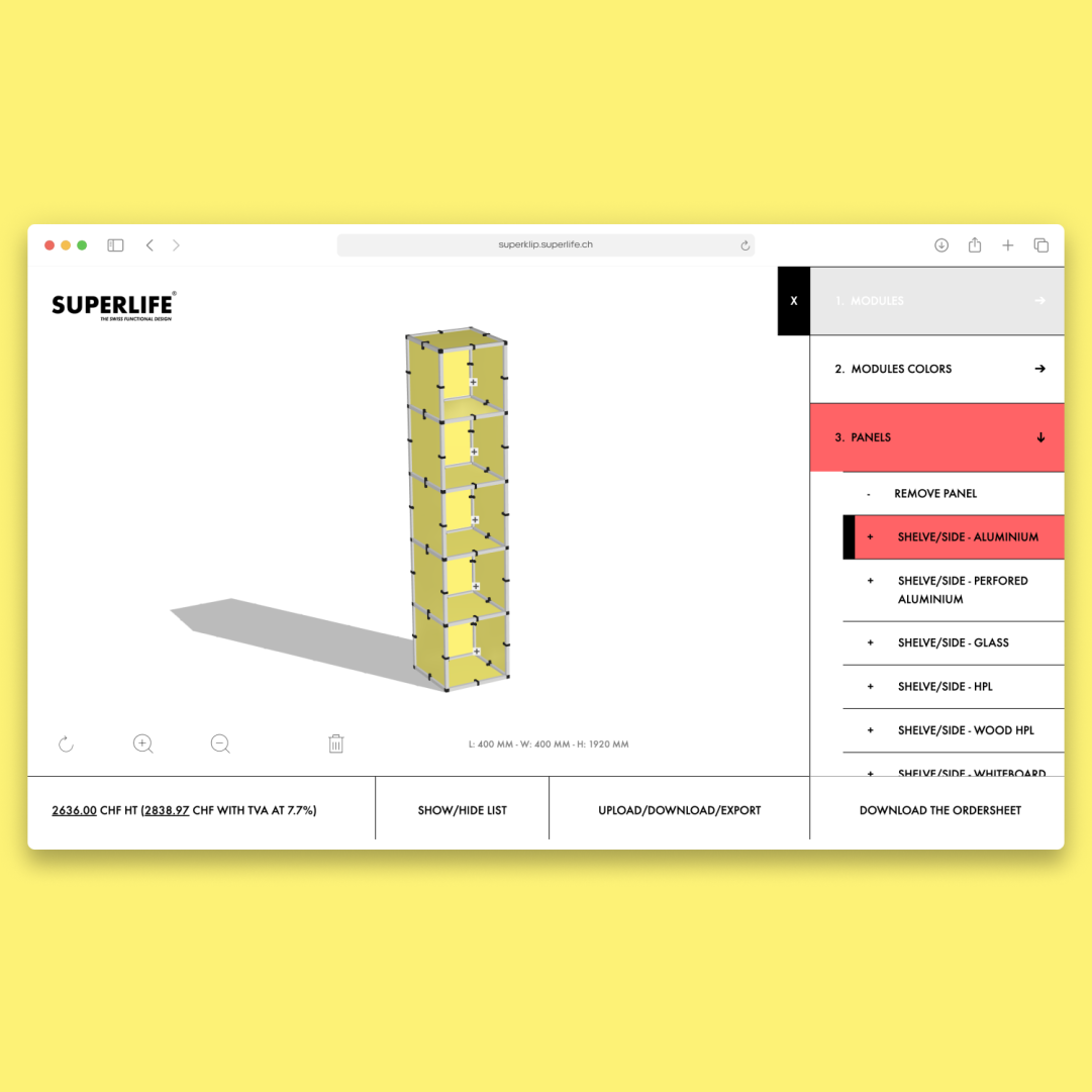 We have designed an online generative tool to enable Superlife customers to create and assemble their own "Superklip" shelves in real time. This new assembly system makes it possible to create modular furniture for any interior space.