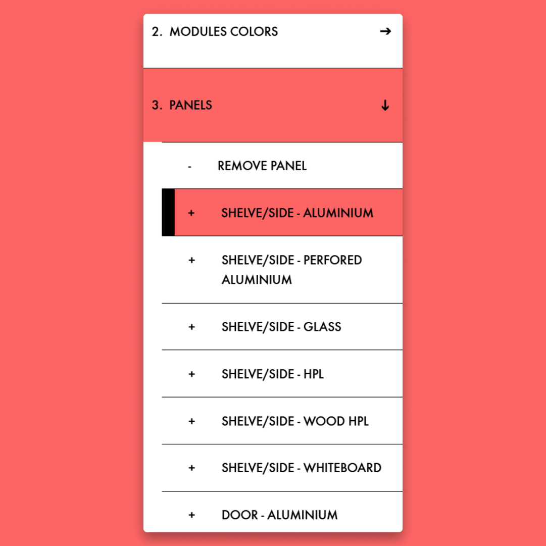 The website is simple and user-friendly, with a 360-degree 3D view of the shelves. Users can choose a basic module and then add or remove modules according to the size of their space. They can also change the colour, type of material or add legs.