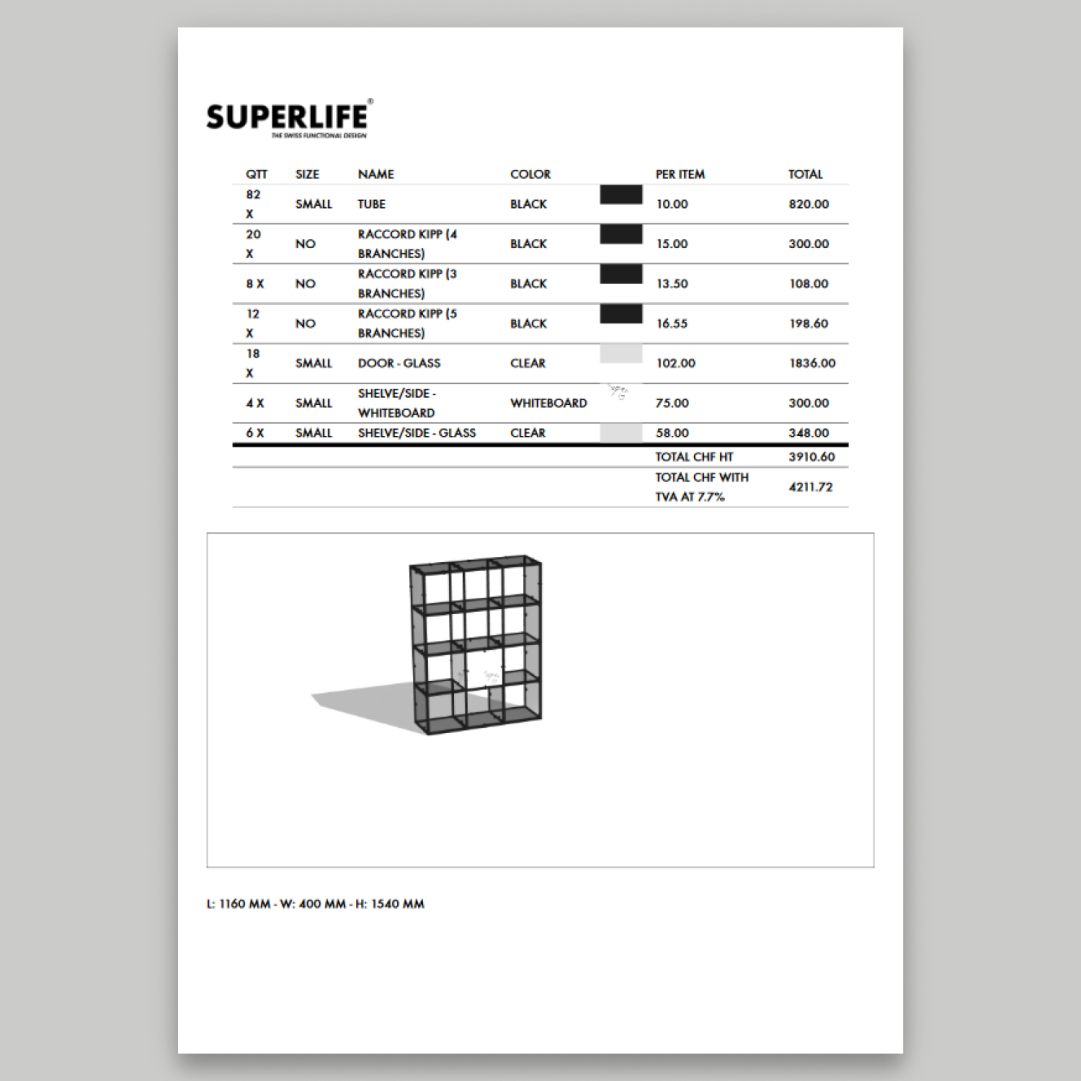 Our software then automatically calculates the price and size of the module, as well as the number of pieces that it comprises. People can also save their creation and come back later to make any final changes before placing an order.